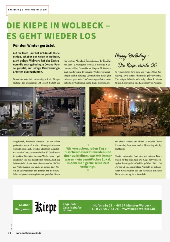 staltung des Biergartens. Ab sofort besteht die netseite der Wolbecker Kiepe (kiepe-wolbeck.de). für den 6. November eine Kiepenparty in Planung. Zeit auch auf Oberflächen wie Computertastatu- nicht zu verschrecken oder Oma und Opa im Al- subjektiv irgendwie bessergeht, verlängern den