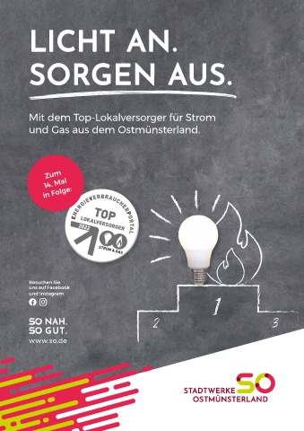 LICHT AN. SORGEN AUS. Mit dem Top-Lokalversorger für Strom und Gas aus dem Ostmünsterland. Zum 14. Mal in Folge: 1 2 3